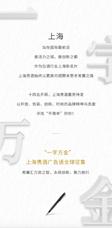 问鼎奖(1名):最终被采用的广告语,将获得每字1万元人民币的终极现金大奖,并授予“开云官方站网页版网站在线登入-开云(中国)”企业大使,尊享全年最高会员礼遇,同时获得开云官方站网页版网站在线登入-开云(中国)青澄黄贵酿1套(天青、阳澄、月黄)及价值14000元美酒礼券包等超值权益。